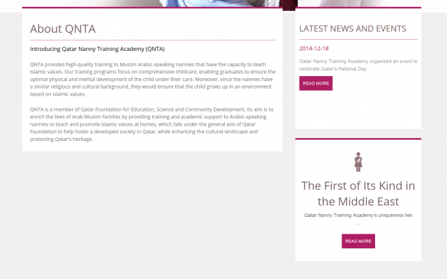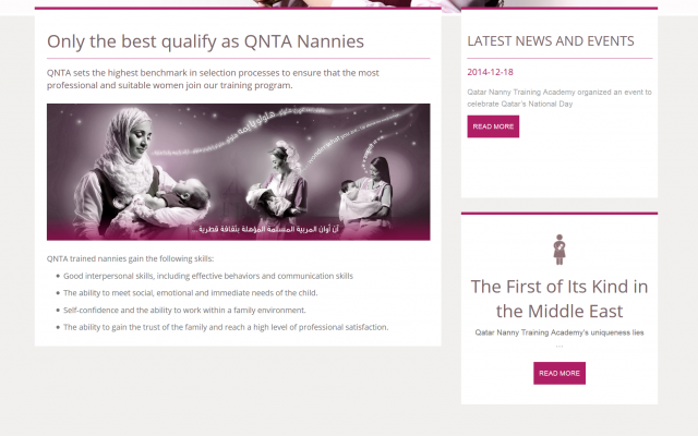 QNTA is a member of Qatar Foundation for Education, Science and Community Development. Its aim is to enrich the lives of Arab Muslim families by providing training and academic support to Arabic-speaking nannies to teach and promote Islamic values at homes, which falls under the general aim of Qatar Foundation to help foster a developed society in Qatar, while enhancing the cultural landscape and protecting Qatar’s heritage.